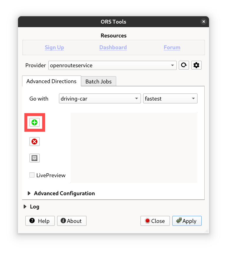 Open the ORSTools plugin by clicking the hexagon icon located in the web toolbar at the top of the QGIS interface.