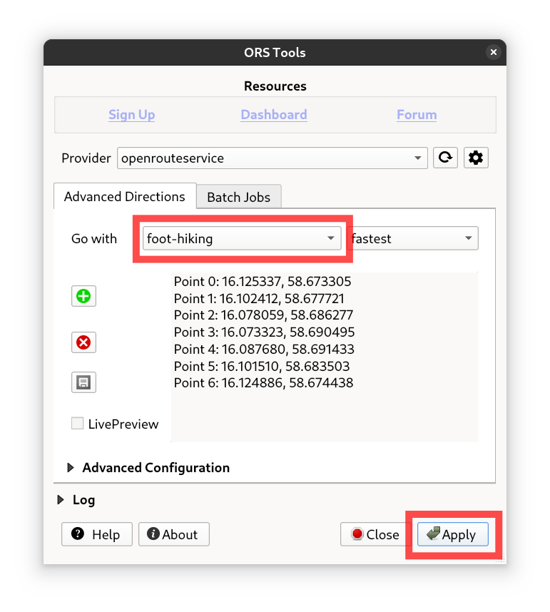 Choose the “foot-hiking” profile from the dropdown menu to ensure the route is optimized for walking on hiking trails. Then click “Apply” to calculate the route based on the waypoints you’ve digitized. ORSTools will then generate the path and display it directly on the map.